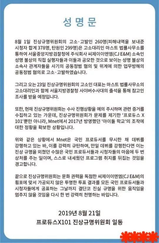 眼见着越闹越大,M-net在7月26日发布官方声明,声明中仅仅承认短信投票计算错误,但否认造假,而且表示计票错误并不影响最终名次。睁着眼说瞎话并没能得到平息民愤。