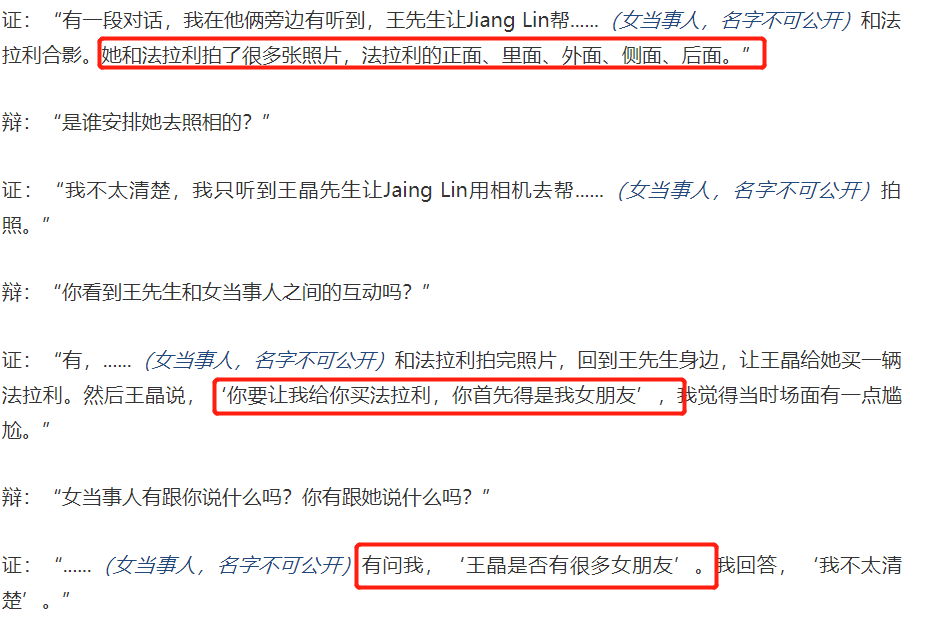 而据另一名剧组发行执行人作证陈述,非常详细的还原了女受害人和王晶之间关于法拉利的一幕,从全方位拍照的样子看,女受害人非常喜爱这辆剧组的法拉利道具,还询问了王晶是否有女友。