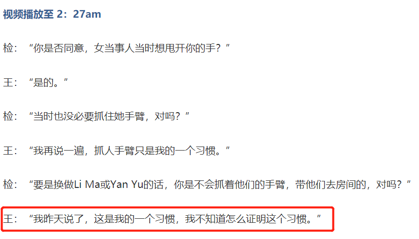 检方对王晶的证词,中途也有不少疑惑,但是都一一被王晶否认,至于王晶用手拉人的动作,王晶多次解释到这只是自己的一个“无法证明的习惯”。恐怕这点也无法成为案件的关键因素。