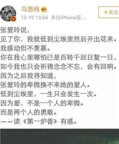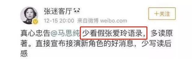 因确定出演张爱玲小说《第一炉香》中的女主,于是马思纯开始积极铺垫她“文青”人设。在微博上了发了一段读后感。