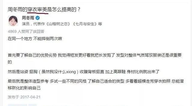 形象上剪了头发的周冬雨简直就像是开了挂,直视自己的缺点,并且找到方法去改善。
