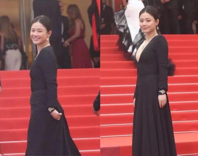 就算是选择了全身黑+大V领的长裙,想要为了掩盖发胖的身材,但似乎也作用不大。