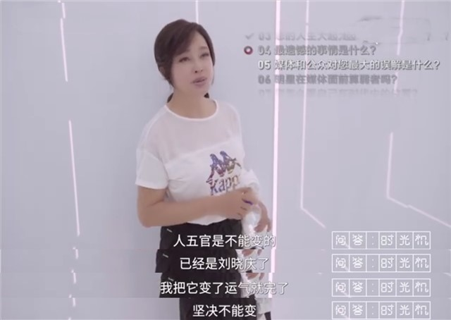 刘晓庆接着补充说到:“人五官是不能变的,已经是刘晓庆了,把它变了运气就完了,坚决不能变。”这也是正面否认了整容的传闻了。