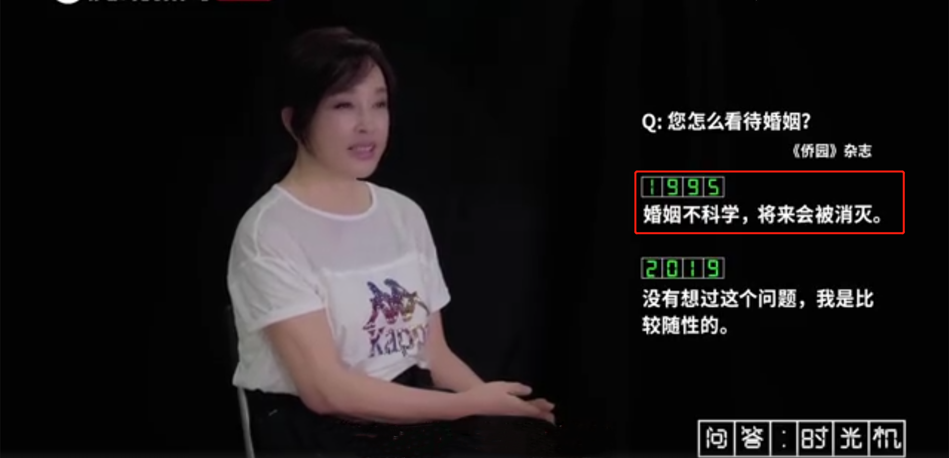 刘晓庆还聊起了自己的婚姻,她的情路十分坎坷,在1995年时曾表示婚姻不科学,将来会被消灭,而在24年后的今天,她已经没有那么抵抗婚姻,只表示:“没有想过这个问题,我是比较随性的。”