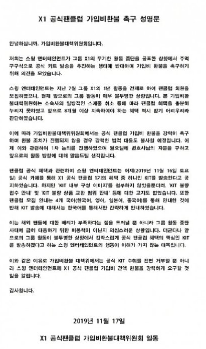 X1的粉丝们在公开信中表示,swing娱乐公司在今年7月以X1进行一年活动为前提招募了X1的粉丝俱乐部会员,但最近swing娱乐公司连续单方面取消X1的活动,侵害了粉丝俱乐部会员的正当权益。X1粉丝俱乐部会员认为swing娱乐公司在剩下的8个月中也无法保障会员们的权益,因此决定退出X1粉丝俱乐部,要求swing娱乐公司退还粉丝俱乐部会员报名费。