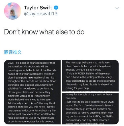 据了解,霉霉与前唱片公司大机器关系一直不和,她曾指责该公司把老歌版权卖给长期霸凌她的斯库特·布劳恩。而近日她再次发文称大机器两任老板不允许她在AMA颁奖礼演唱任何旧歌,在自己和Netflix合作拍摄的纪录片中因没提及他们或大机器,也被要求里面不可以有旧歌或旧现场视频的出现,“Scott表示若我明年不重新录制我的歌曲,或不再公众面前谈论他们,才同意我使用我的音乐”。