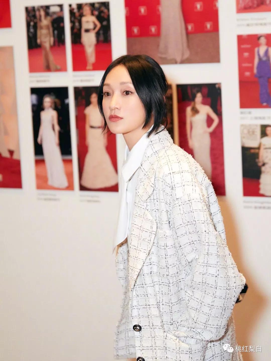 一身Chanel白色呢子套装的周迅,走的还是一贯的灵动知性路线,纯白的全套服装配上黑色小短袜,还挺前卫有型的,在她身上出现倒是一点都不突兀。