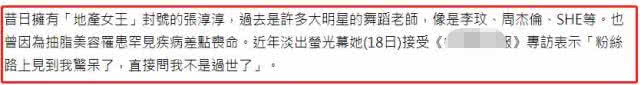 娱乐圈中许多明星为了让自己拥有完美身材,除了健身节食之外,还尝试过做抽脂美容。据台媒11月18日报道,台湾著名肢体与体能训练老师张淳淳曾因为抽脂美容罹患罕见疾病差点丧命,11月18日,淡出娱乐圈多年的张淳淳接受了个人采访,透露了自己在抽脂之后患上了一种罕见疾病,病情严重住院了许久,却不曾想因此被传去世,导致粉丝在路上偶遇她的时候惊呆了,直接问:“你不是过世了