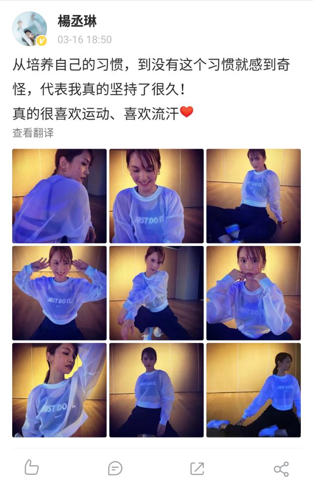杨丞琳表示:“从培养自己的习惯,到没有这个习惯就感到奇怪,代表我真的坚持了很久!真的很喜欢运动、喜欢流汗”,网友评论到:向你学习!照片真好看!