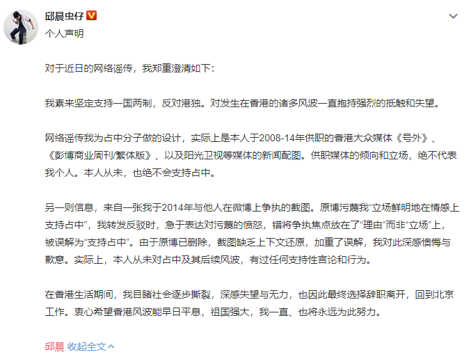 据悉,近日《奇葩说》辩手邱晨昔日疑参与的“占中”的活动海报设计一事曝光,引起了全网友的热议。随后,又有网友扒出了邱晨几年前在社交平台上疑似支持“港独”言论。