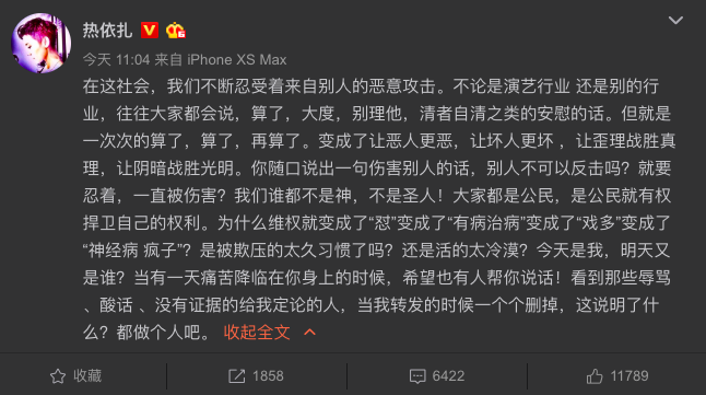 在法律上,微博最“玄幻”的地方在于,普通人和明星尽管在微博上的地位平等,但由于双方影响力差距巨大,在界定名誉侵权问题时的司法态度并不相同。换句话说,一个微博上50粉丝的人的发言和一个微博50万粉丝的人发言产生的社会影响并不一致。所以即便我们承认那些在微博上攻击热依扎的用户存在侵权行为,但受限于其微弱的影响力,这种伤害即便被称为“网络暴力”,但其影响是有限的。