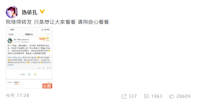 11月2日,热依扎在社交平台上转发大量侮辱类和质疑类言论,引发网友热议。随后,她在暂停了一段时间后,开始继续转发恶评,并发文称:“继续转发,只是想让大家看看,请用良心看看。”