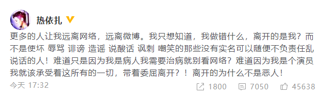 她也发文称:“更多的人让我远离网络,远离微博。我只想知道,我做错什么,离开的是我?而不是使坏 辱骂 诽谤 造谣 说酸话 讽刺 嘲笑的那些没有实名可以随便不负责任乱说话的人!难道只是因为我是病人我需要治病就别看网络?难道因为我是个演员我就该承受着这所有的一切,带着委屈离开?!离开的为什么不是恶人! ”