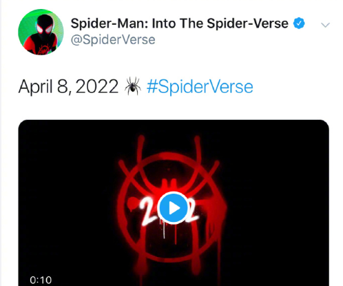 果然,随后官推带来了重磅消息,宣布《蜘蛛侠:平行宇宙》的续集定档于2022年4月8日北美上映。