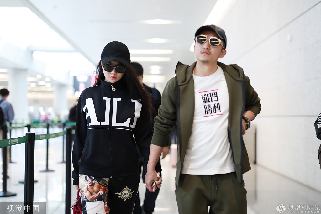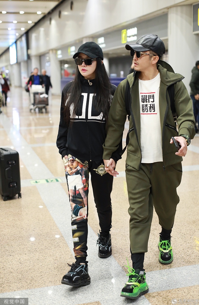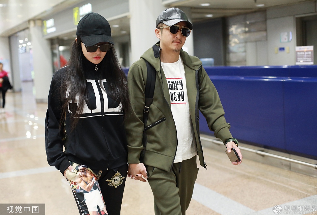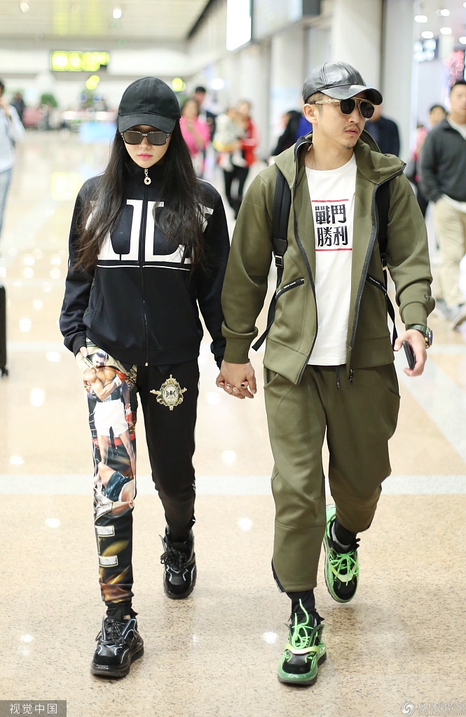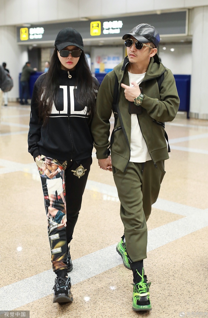 邹市明则一身绿色运动衣,同样戴着棒球帽和墨镜,夫妻俩气场十足。