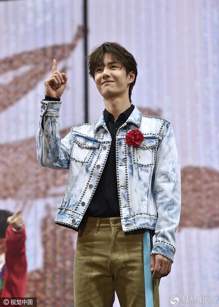 王一博穿铆钉牛仔外套外加一束红花点缀,帅气不失俏皮感。 图片来源:视觉中国