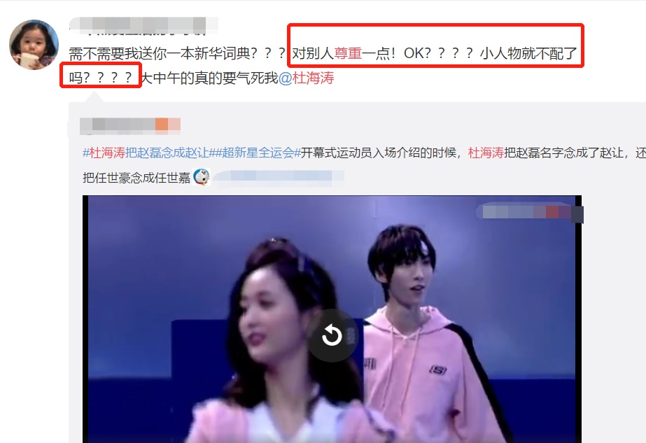 在选手入场环节,杜海涛接连口误。先是嘴瓢把赵磊念成了赵让,后来他还把任世豪念成了任世嘉。作为主持人,背熟流程是基本要求,可杜海涛却读错好几个名字,不免让粉丝觉得主持人轻视自己偶像、势利眼,甚至为此感到愤怒。