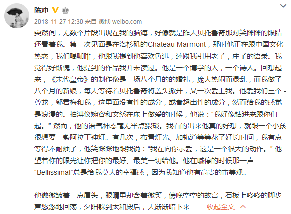 去年11月,《末代皇帝》的导演贝纳尔多·贝托鲁奇导演过世,陈冲在微博上回忆起拍摄时的感受:“《末代皇帝》的制作像是一场八个月的的婚礼,庞大热闹而混乱。而我做了八个月的新娘,每天等待着贝托鲁奇将盖头掀开,又一次爱上我。”