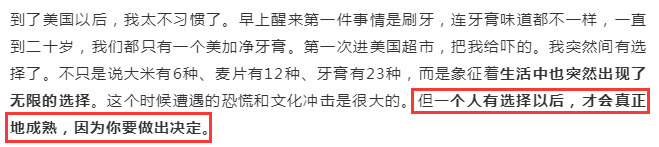“一直到二十岁,我们都只有一个美加净牙膏。第一次进美国超市,把我给吓的。我突然间有选择了。