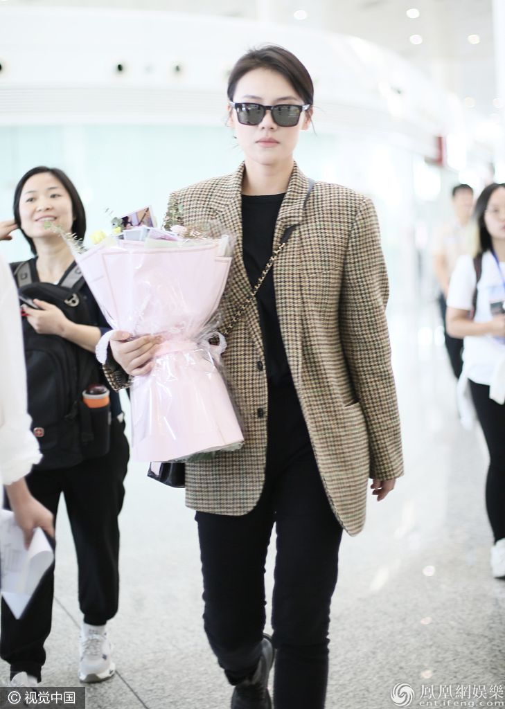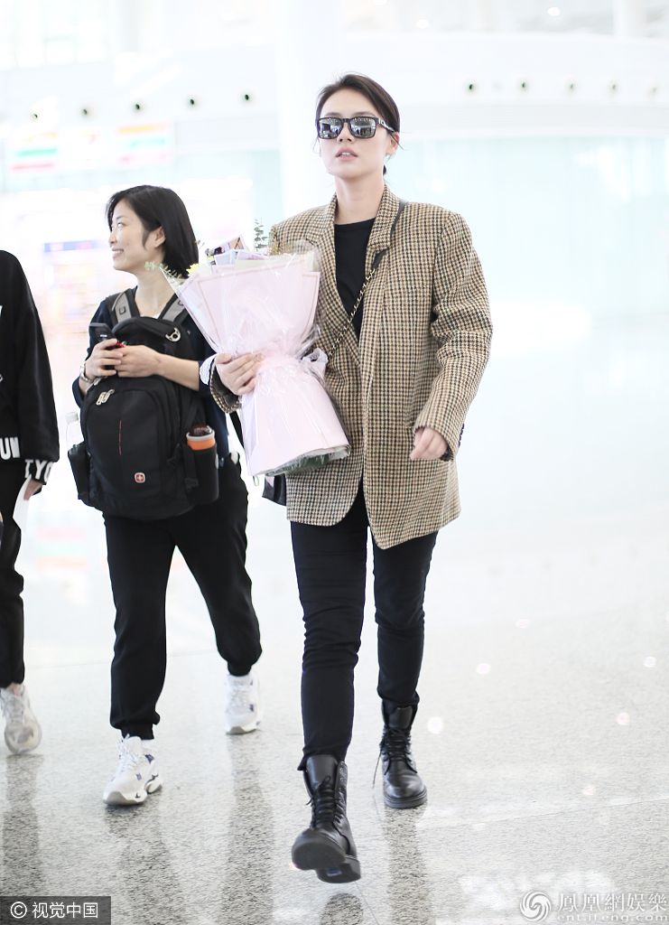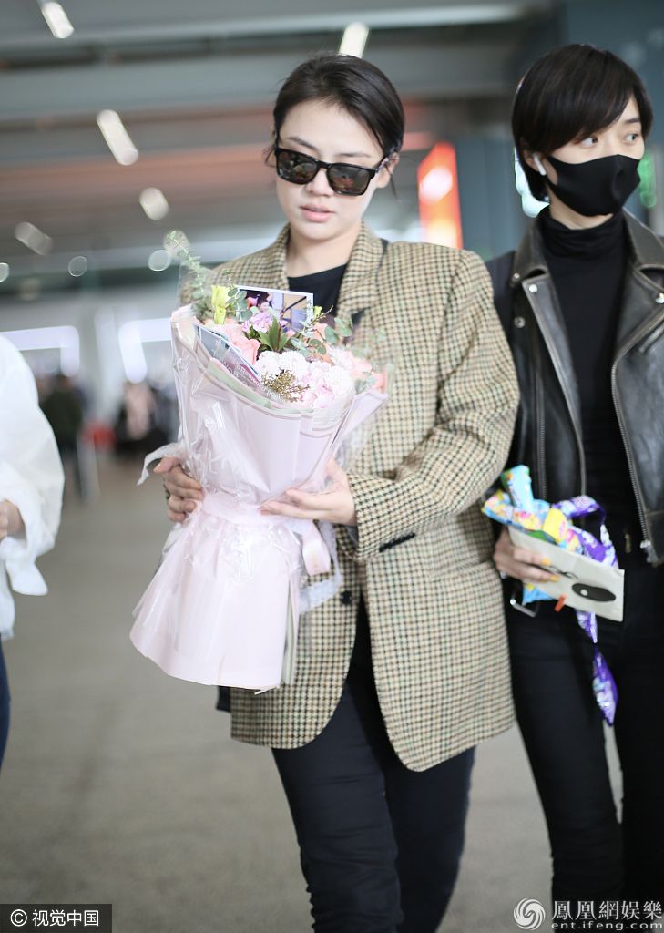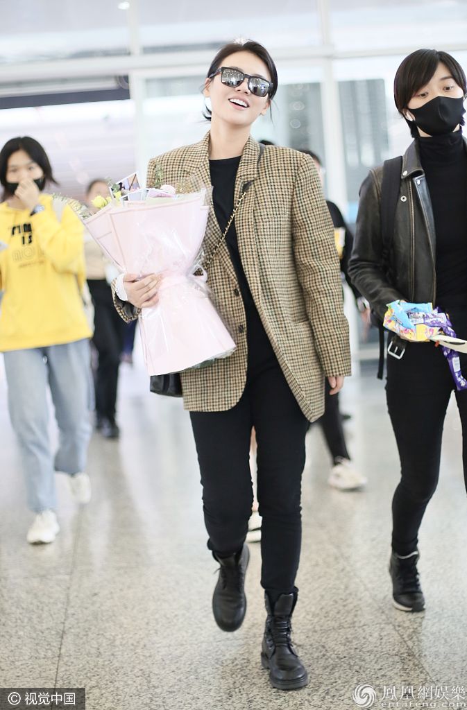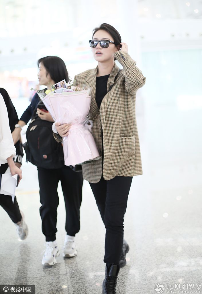 2019年11月01日,深圳,马思纯现身机场。她穿着格子风衣外套和黑色长裤,获粉丝接机送花笑容十分灿烂。马思纯捧着鲜花一路快走,与粉丝们亲密热聊毫无架子,简直太暖心啦! 图片来源:视觉