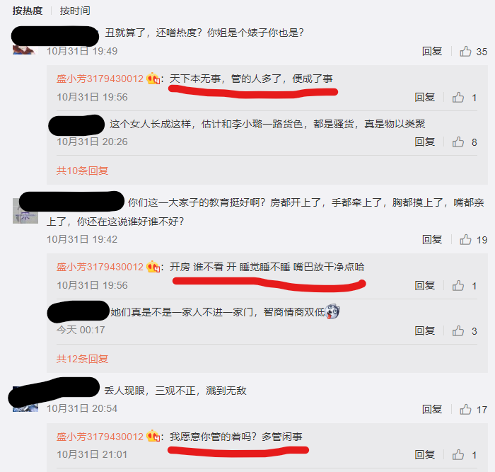 她还在评论区回复愤慨的网友:天下本无事,管的人多了,便成了事。还说:开房,谁不看(开),睡觉睡(谁)不睡。当有人说她三观不正的时候,她也回怼:我愿意,你管得着吗?