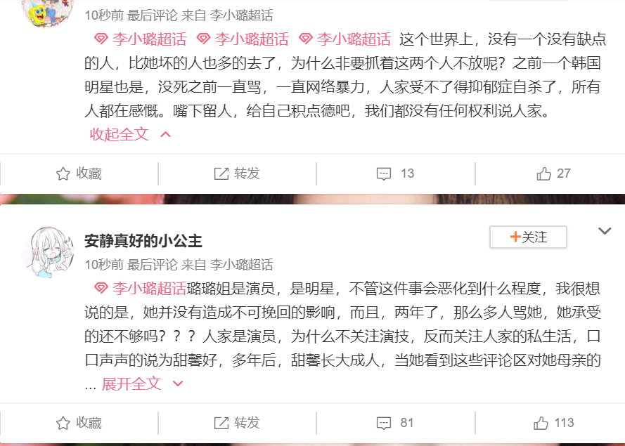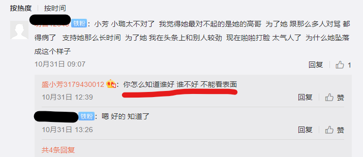 其实在事发后的第二天早晨,就有粉丝在小璐表妹盛小芳的社交平台上留言,称觉得小璐实在太不对,尤其是对不起为她说话的高菘骏哥哥,为了她高菘骏与很多网友互怼,之后还患上了淋巴癌。粉丝还表示为了支持小璐自己也在网络上与人较劲,现在却啪啪打脸,为何她会堕落至此?