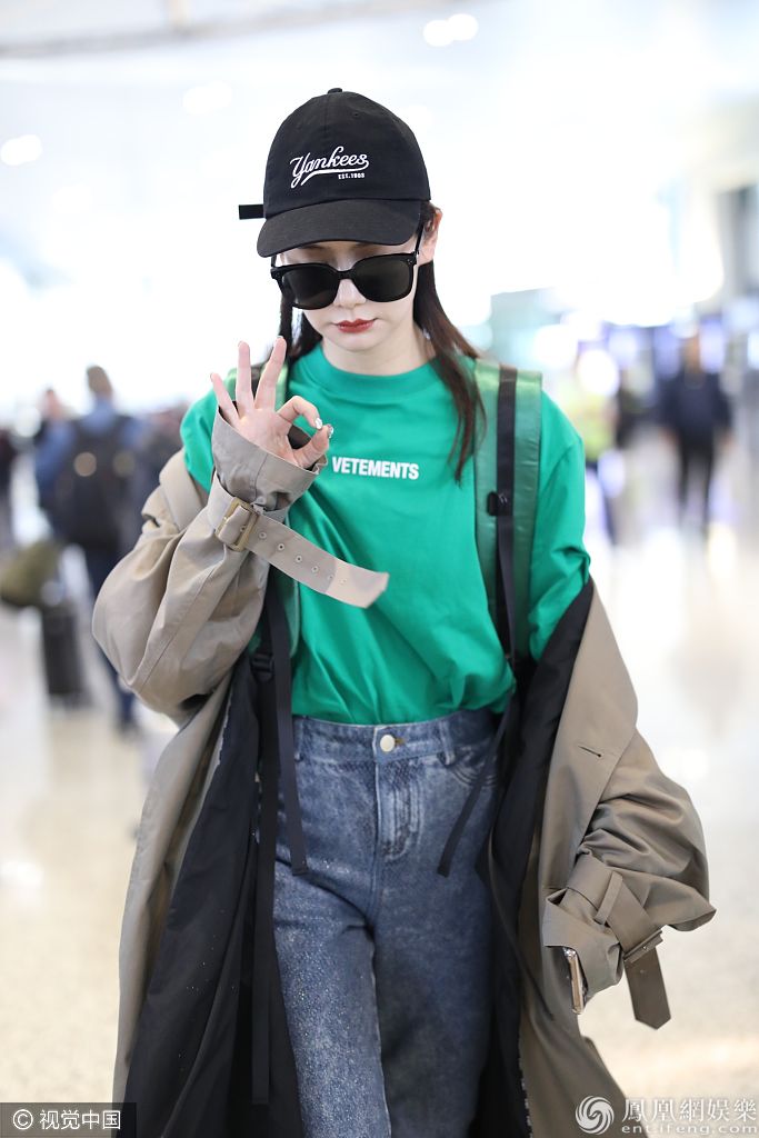 2019年10月31日,上海,戚薇现身机场。她肩披长风衣半穿半脱大秀穿搭功力,黑超遮面对镜比ok手势气场超强。 图片来源:伪装者/视觉