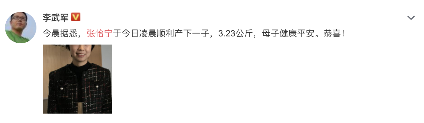 10月30日一早,有体育媒体人,在社交平台发文宣布,奥运冠军张怡宁凌晨顺利产下儿子,孩子足足有6斤,母子平