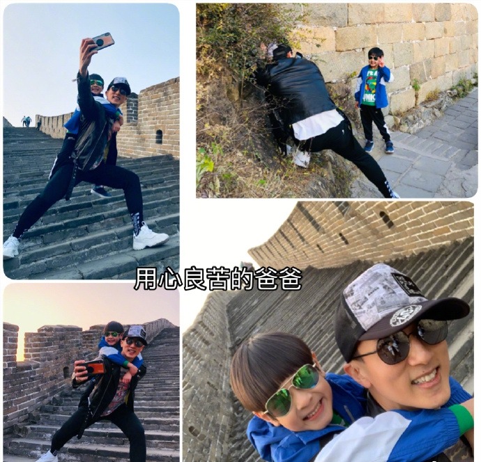 吴尊背着儿子自拍。