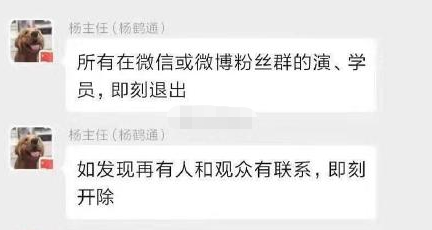 10月30日,有网友爆料称,德云社要求所有演,学员退出粉丝群。网友晒出德云社演员其中一粉丝群内聊天截图,截图内容显示,德云社要求所有在微信或微博粉丝群的演员,学员即刻退出,并称如再发现有人和观众有联系,即刻开除。