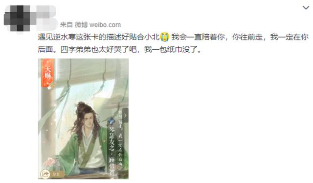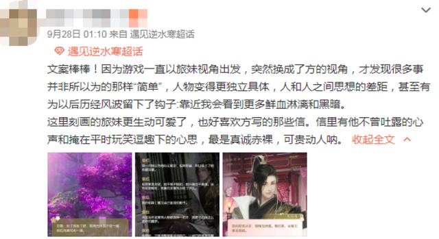这个被多家粉丝马克来告白偶像的恋爱游戏是《遇见逆水寒》,是一款恋爱古风手游,玩家可以以第一人称视角体验不同的故事剧情,揭开每个主角线的故事情节,与小哥哥或小姐姐结缘并建立羁绊。典型的恋爱手游都包含了文字冒险元素,而《遇见逆水寒》也不例外。文字可以说是这类游戏的精髓了,从几个月前游戏刚刚上线到现在,《遇见逆水寒》的文案一直保持着很高的水平,受到不少夸赞:
