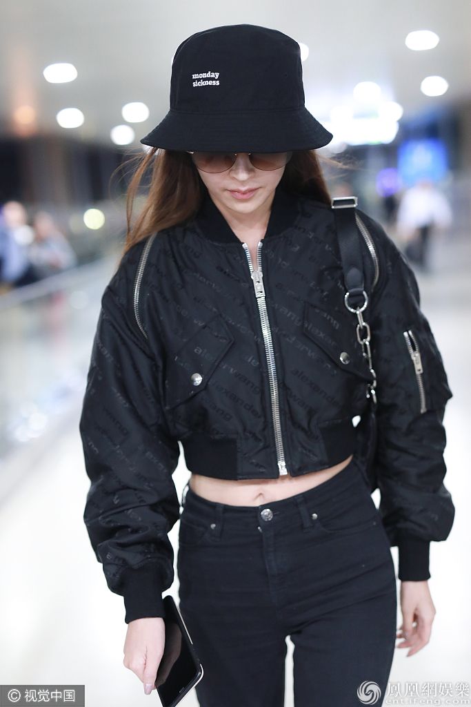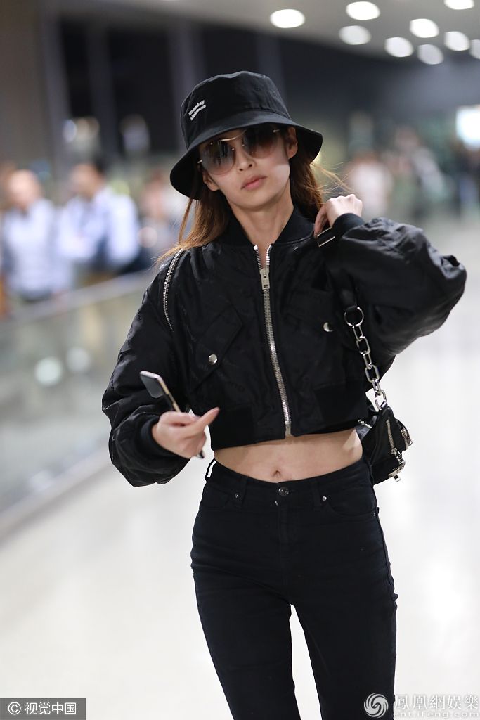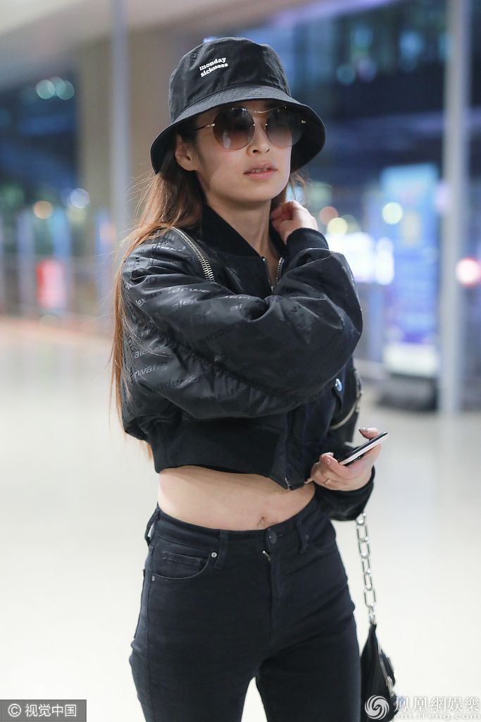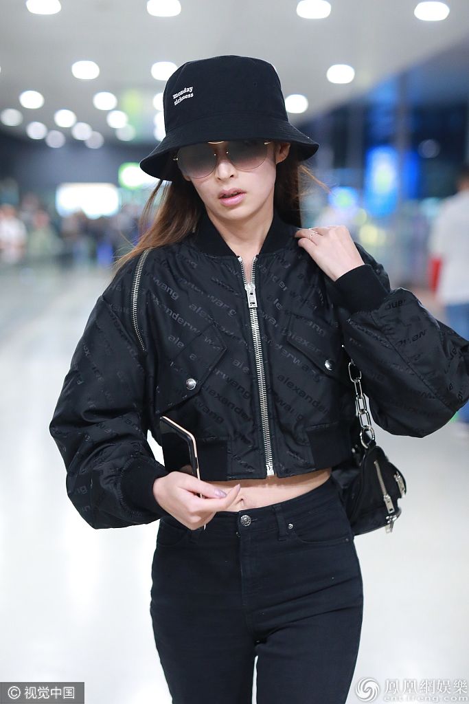 2019年10月39日,上海,颖儿现身机场。新晋辣妈颖儿大冷天穿夹克秀蜂腰细腿,身材真是绝了,全黑look造型美又飒。 图片来源:6月boy/视觉