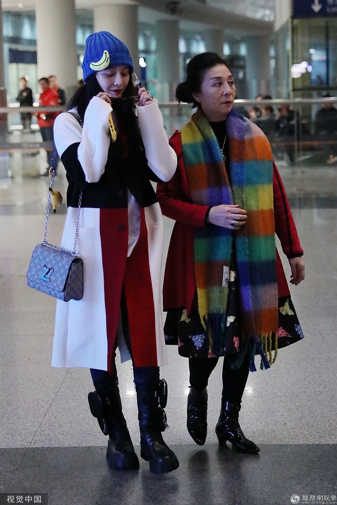 甜美造型似明艳少女,手上超大鸽子蛋十分抢镜。妈妈身披彩虹色围巾,穿着时髦。