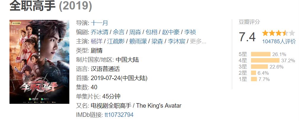 2019年暑假,《全职高手》上马,豆瓣7.4,成为了杨洋最近7年第一部上7分的影视作品,虽然不至于去谈演技如何进步,但至少算是从油腻的洼地里爬出来了。