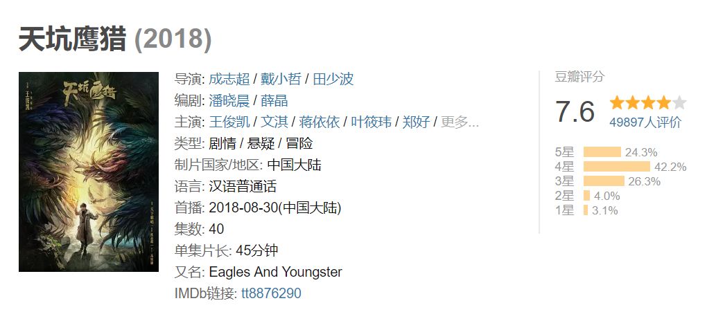 考北电,演《天坑鹰猎》(7.6分),虽然表演看上去还是有些稚嫩,但足以夸上一句进步。