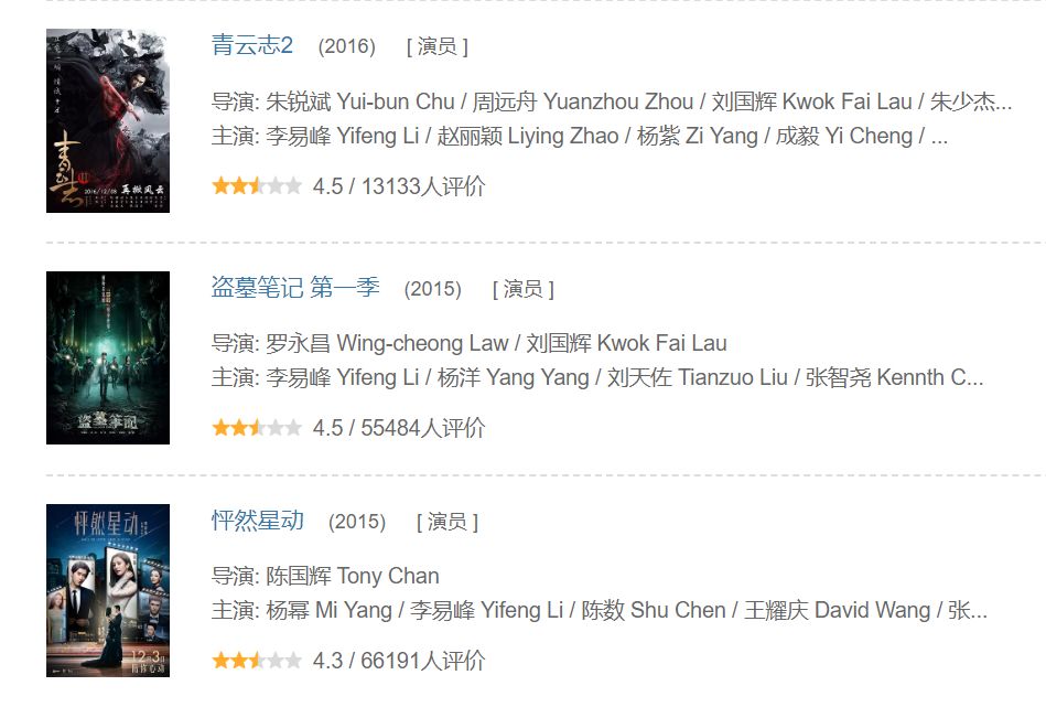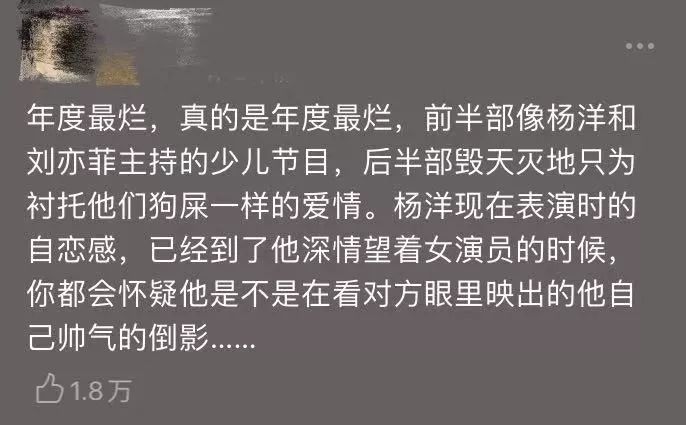 18年之前李易峰在豆瓣的平均分哪怕算上配角《老炮儿》,也只有可怜的5.3分 大部分作品都并不是在借力他的演技,而是在用各种镜头和剪辑去消费那张白净的脸。 他拙劣的演技被各种浅景深镜头,脸部特写放大,面瘫的名号甚嚣尘上,这种骂声在他拿下百花最佳男配的那个晚上达到了一个耻辱柱般的顶峰。