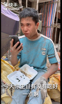 大炮在工地吃盒饭,骗老婆说自己有大鱼大肉吃,不想让老婆知道自己打工很辛苦。