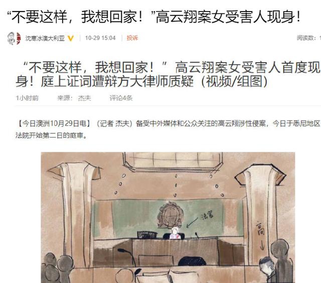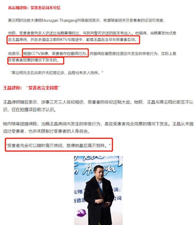 10月29日,据澳大利亚律师最新消息指出,在高云翔一案中,女受害人首次现身,并且还原了被侵犯的过程,其中不乏露骨的描述。但是高云翔和王晶却对女受害人的证词表示否认,强调对方是“自愿的