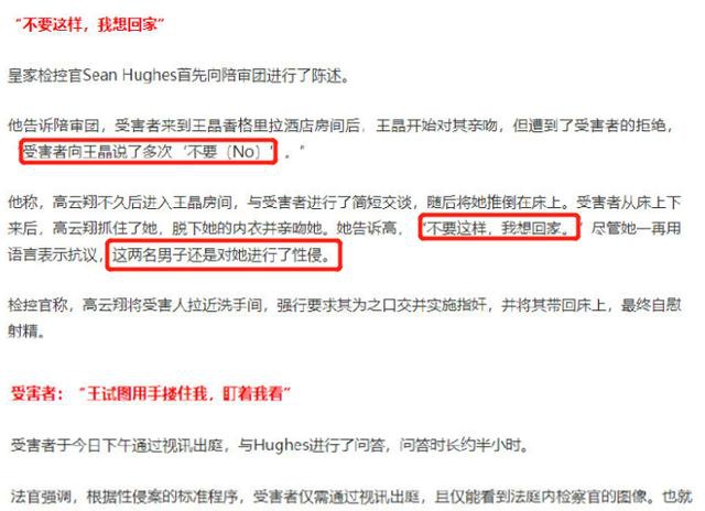 进入房间后,该女子试图从高的身边离开,但是高云翔和王晶都抓住了她,开始脱她的衣服,然后两人违反其意愿,强迫与她发生了性行为。在这期间,女子一直用语言表示抗议,重复说着“不要”。