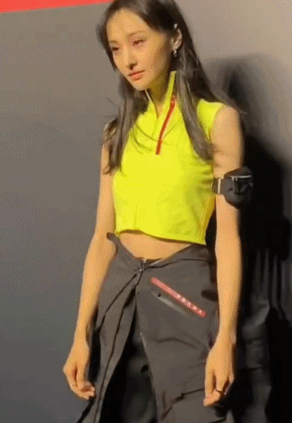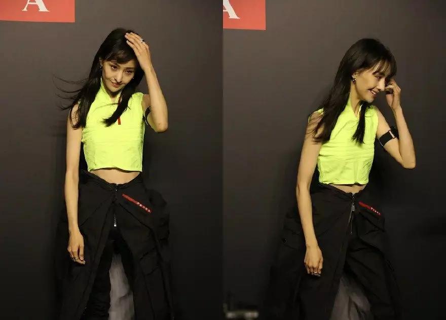 当天郑爽穿了一身机车风的look,荧光色的上衣很抢眼。