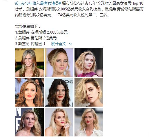 近日,福布斯公布了过去10年“全球收入最高女演员”的名单。詹妮弗·安妮斯顿、詹妮弗·劳伦斯与斯嘉丽·约翰逊占据榜单前三