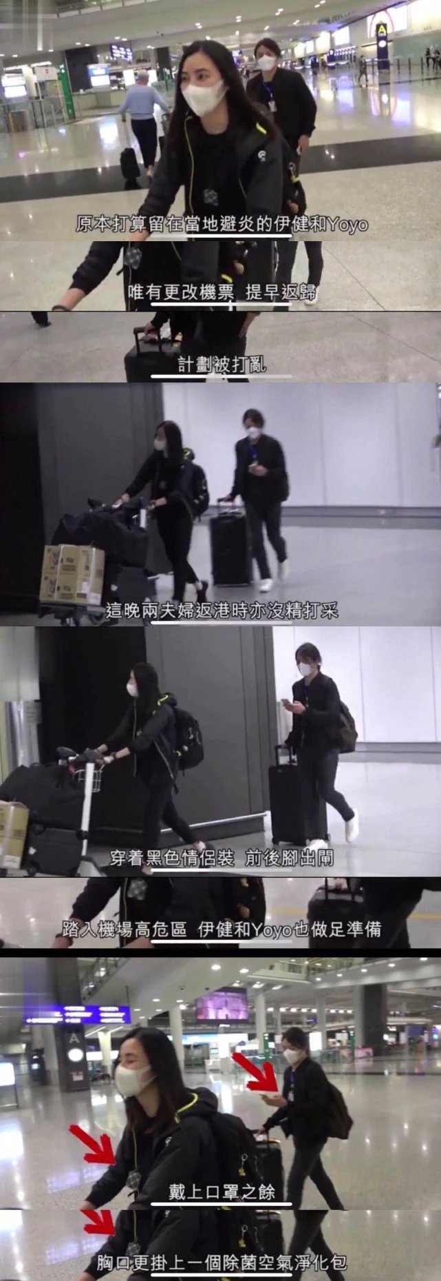 回到香港,二人“严阵以待”,均戴上口罩,脖子也挂着小型空气净化包。