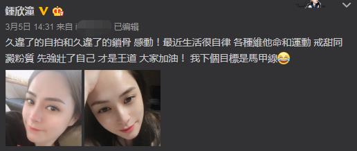 不过,阿娇发出来的都是大头照片,并没有发出全身照,其实阿娇最近才减肥成功,前几日还在个人社交网上感叹称:“久违了的自拍和久违了的锁骨,感动!最近生活很自律,各种维他命和运动,戒甜同淀粉质,先强壮了自己,才是王道,大家加油!我下个目标是马甲线。”