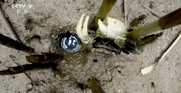 而窝中刚刚孵化,仅剩的那一只,馋得螃蟹们施展开飞檐走壁的技巧,纷纷往上爬。