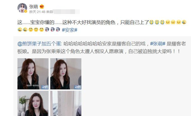 相比之下,另一位老板娘张萌(《安家》另一个出品方耀客传媒创始人吕超的老婆)在角色方面就不太讨喜,因为她在戏中扮演“妖精”张乘乘,跟徐姑姑假离婚期间,她不守妇道,出轨了自己公司的实习生天天,怀孕后却将锅甩给徐姑姑,徐姑姑不依,她就三番五次跑到店里闹事,还害得房似锦停职,因此张乘乘成了网友口中“气人队”的队长。