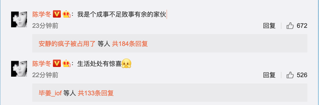 随后,他还在评论中调侃自己是:“成事不足败事有余的家伙 ”,还表示生活处处有惊喜。此前,陈学冬还曾在微博晒倒立的照片,并称:“动动筋骨!”结果却把脖子扭了。