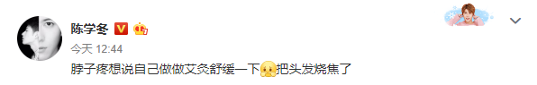 3月15日,陈学冬发文分享宅家日常,他写道因为脖子疼想自己做做艾灸舒缓一下,结果却把头发烧焦了。
