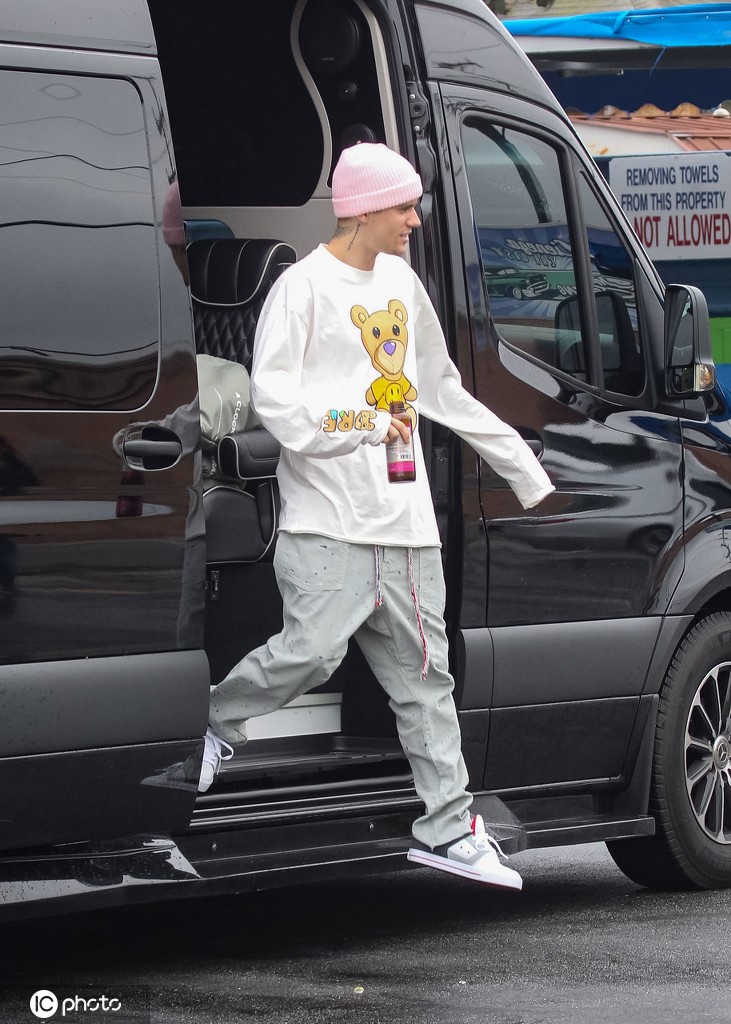 比伯下车去拍照,笑意满满。(图片来源:东方IC)