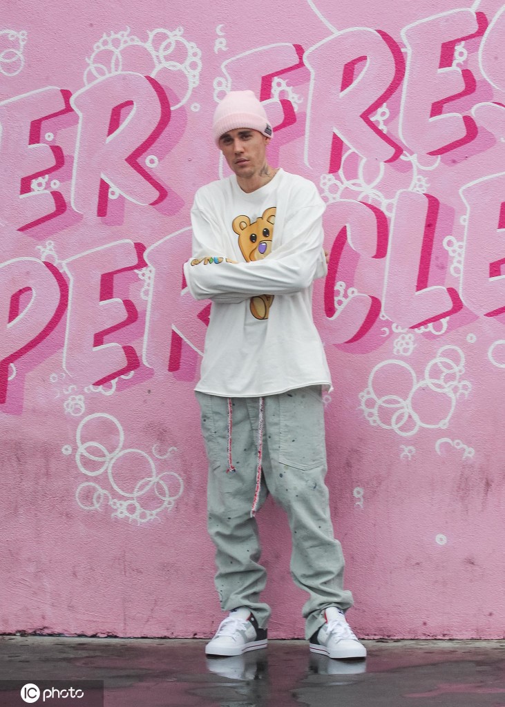 据悉,当地时间2020年3月15日,美国洛杉矶,贾斯汀·比伯与妻子海莉·比伯现身街头。见到粉红背景板下兴奋求拍照,海莉甘当摄影师。(图片来源:东方IC)