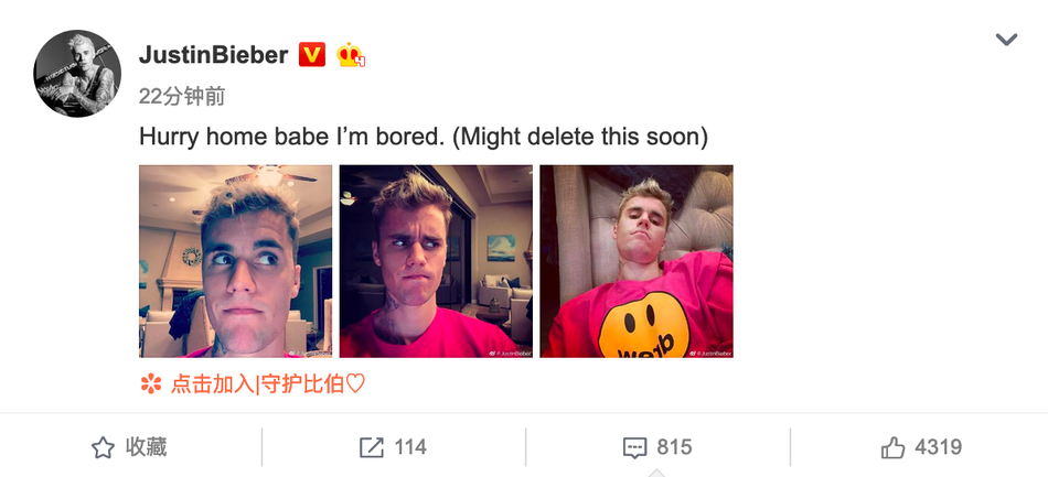3月15日,贾斯汀·比伯晒出自拍照,并发文“快点回家,宝贝,我快无聊死了